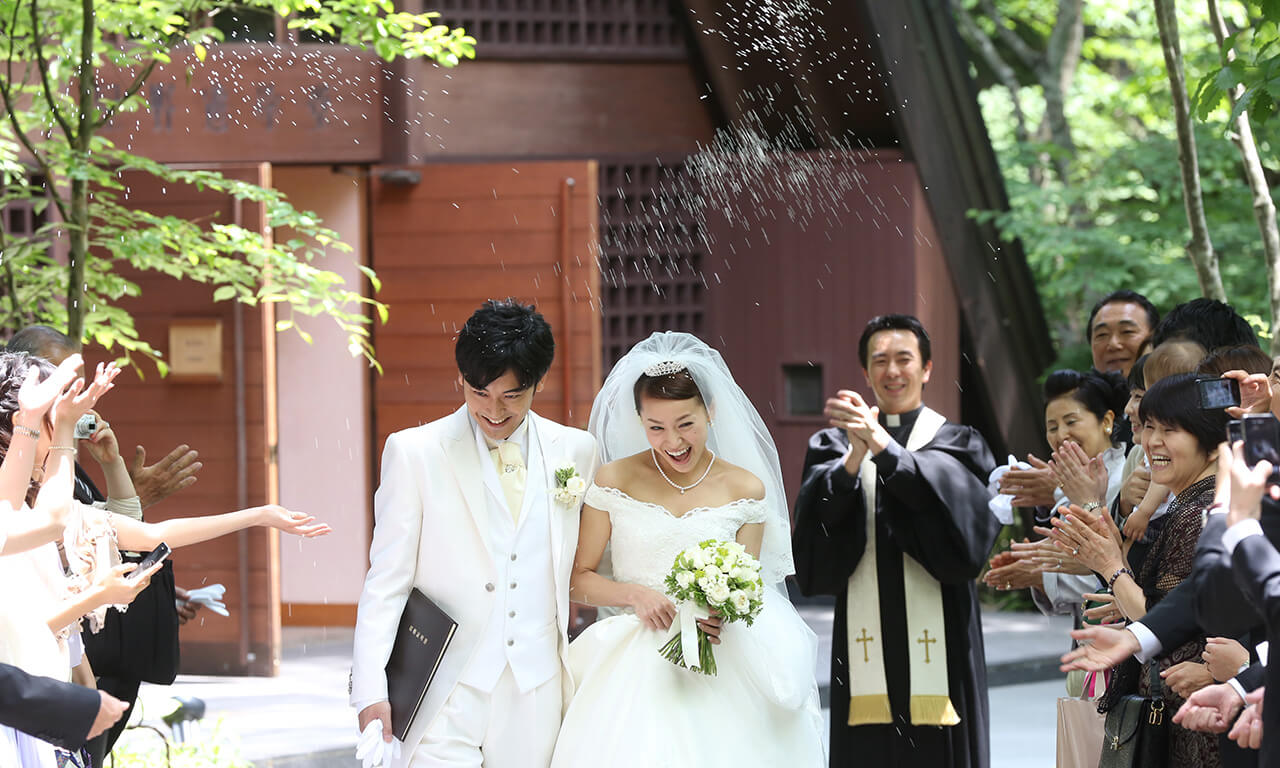 軽井沢高原教会の挙式では、新郎新婦の実りある人生を願いライスシャワーを行います。