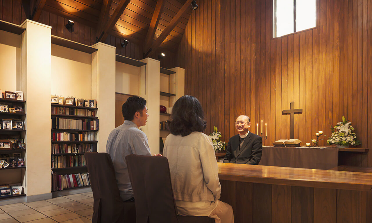 観光で教会を訪れた方がふっと立ち寄り、牧師とのお話を楽しまれる場面も。人々の絆を育む場所として、多くの方を迎え入れています。